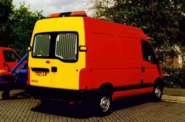| Details: Another example of a bus support van delivered in plain red with yellow doors (ready for application of chevrons) is seen with this shot of Renault Master 4919R (T102LLB) at Acton. Two such vans were leased in 1999 and represented a change in designation of the R suffix from mobile cranes. This design of van is also built by Vauxhall as the Movano and several of these later entered the fleet. | ||||