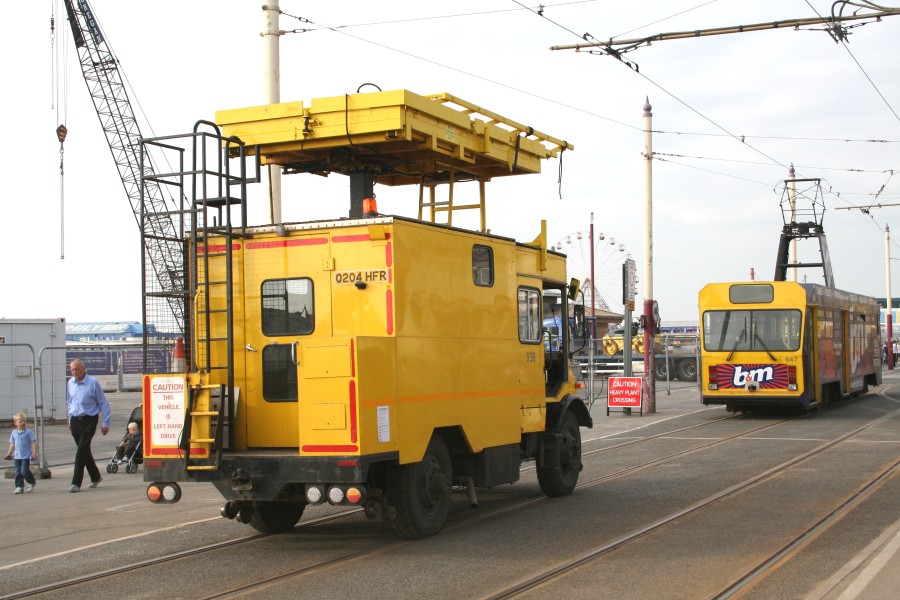 | Details: A back view of Blackpool Transport 938 on the sea front on 18th September 2009 shows the rear access ladder and the single hydraulic ram used to raise the platform. In front is 'centenary class' tram number 647, built in the mid-1980s with bodywork by East Lancs. | ||
