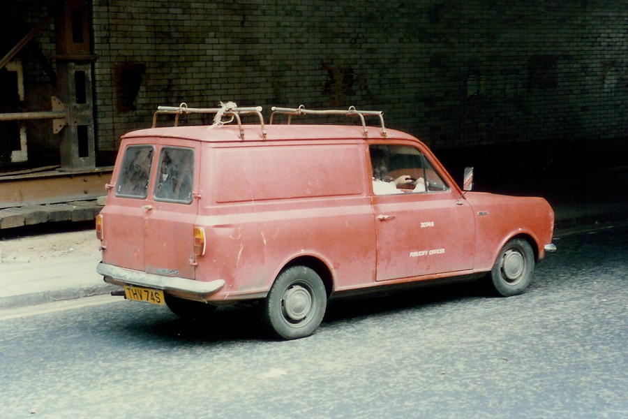 | Details: The rather tatty condition of this Bedford HA van would suggest that the photo was taken some time after it left London Transport service. However, it notably retains not only the fleetnumber but also the 'Publicity Officer' lettering. 2074B was one of 12 HAs delivered in November 1977 (following a batch of 16 earlier that year), and was allocated to Walthamstow garage for most of the next 5 years. It then saw a further 5 and a half years use with subsequent owners. AKA 'Back of a red HA under a bridge, number 1'. | |||