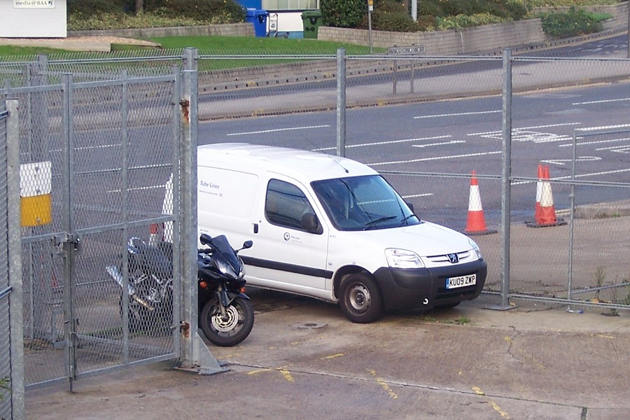 | Details: About ten Peugeot Partner vans were delivered in March 2009 although we have had difficulty tracking them all down. All carried overall white livery, some having Tube Lines logos and others operating anonymously. One that is easy to find is 6751, allocated to Heathrow Airport Central. It is usually parked in a compound near the bus/coach station, as seen here on 21st November 2009 from the upper deck of a bus. The road in the background is the main airport exit road towards the tunnel. | ||||