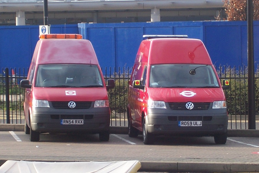 | Details: The batch of high-roof Volkswagen Transporter vans used by the London Buses Infrastructure Development Unit are among the longest-lived members of the leased fleet, having been new in January 2005. A start was finally made on replacing them from December 2009, with a batch of similar vans with fleetnumbers around 1,150 higher. As this photo taken at Stratford Bus Station on 14th December shows, the new vans are virtually identical in design but have differences in lettering and the type of light-bar fitted. The faded roof panels of the older van are typical of the batch. | |||||