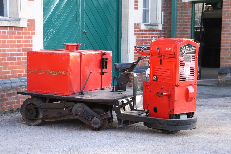 | Details: Preserved London Transport depot sweeper RL92 was moved during 2009 from Cobham Bus Museum to Twyford Water Works, where it was photographed on New Year's Day 2010. This view highlights the way in which the engine is mounted directly above the front wheel, and turns with it. The operator sits on the 'saddle' mounted on the main unit, and steers using the handle fixed to the engine housing. It would appear that there is no drive connection between the engine and the main unit, with the brushes being driven using chains from the trailing axle. However, there are at least four controls visible on the body (two levers, one pedal and one hand wheel). These presumably raise/lower the brush, move the brush scraper, control the water flow, etc. | |||
