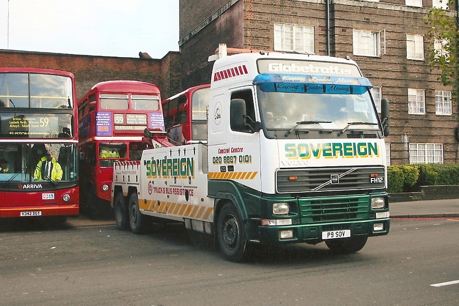 | Details: Staying at Brixton Garage now but going back a couple of years, this photo was taken on 8th December 2005. This was the penultimate day of normal Routemaster operation in London, route 159 being their last allocation. The photo shows previously unseen Volvo FH12 recovery truck P9SOV of Sovereign Recovery, towing an unidentified Routemaster out of the garage. The amount of green in the Sovereign livery was later reduced, while the fleet of Volvo trucks was joined by some DAFs. | ||||