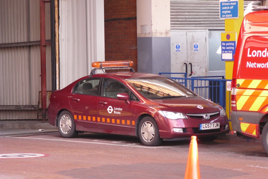 | Details: New in September 2007, 6308H was the only one of the 16 Honda Civic hybrid saloon cars leased for London Buses to gain a 57 registration. It was also notable for being the only liveried example never to carry its fleetnumbers. For its first year and a half it was based at Victoria Coach Station and was hardly ever seen. However, during 2009 it migrated to Uxbridge Bus Station, making it much more visible! On 19th February 2010 the car was parked behind one of the resident IRU vans. | ||||
