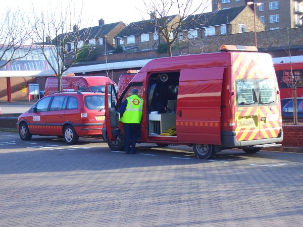 | Details: Yet another picture taken at Eltham Bus Station on Saturday 17th January 2004 shows Ford Transit 125 T300 Hi-Top Van 5583F (KJ53UMM) with its side doors open. In front is Vauxhall Zafira 5567V (LT53GJF), while a pair of Movanos are in the background. | |||||