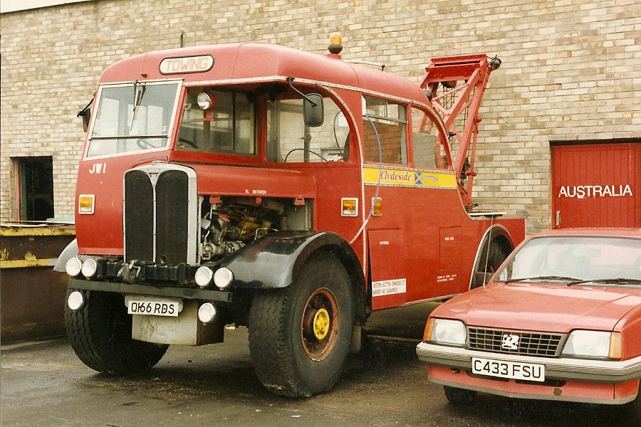 | Details: Now this is the sort of thing that most people probably think of a service vehicle! The first of 8 scans from Malcolm Conway's collection, this is Clydeside Scottish JW1 at Johnstone Garage on the 30th of June 1990. Although of half-cab configuration, the vehicle was never a bus. As the name on the bonnet suggests, it is an AEC Matador. The original registration is not known, although the Q/RDS series was used on several former buses in Clydeside's service fleet. Note that although the fleetname is Clydeside Scottish, the legal lettering reads Western Scottish. Clydeside was created from part of Western Scottish in 1985. The two merged in 1989, then split again in 1991! Note also the door to Australia in the background! | ||