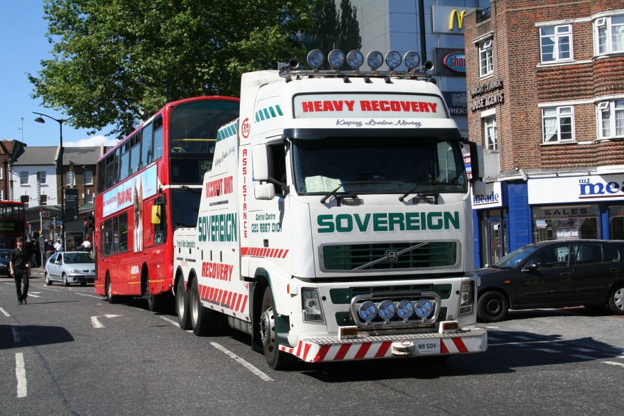 | Details: Sovereign Recovery N9SOV is another 3-axle Volvo FH with Boniface bodywork, photographed rescuing an Arriva London VLW bus at Wood Green on 23rd June 2009. Almost identical to sister N8SOV, it lacks the bumper mounted winch and consequently has different front lights in this area. | |||