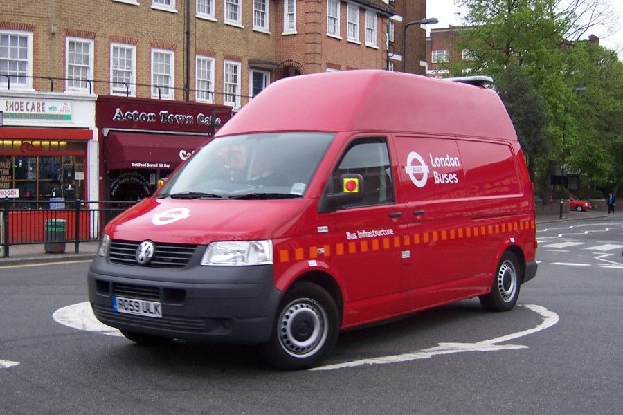 | Details: Ten Volkswagen Transporter vans were leased for London Buses use towards the end of 2009, comprising 7 high-roof and 3 mid-height examples. Three each were allocated to Orpington and Stratford, with one apiece at Kingston and Aldgate. The remaining two have proved elusive although they appear to be based in west London. High-roof 6824VW was not seen until well into 2010 and Ray caught it crossing the new roundabout outside Acton Town Station on 26th April. This van also differs from the others in the batch in having cab-side lettering for 'Bus Infrastructure' rather than 'Infrastructure Development'. | |||