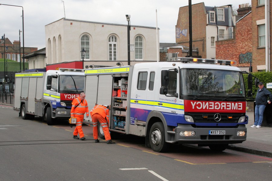 | Details: There were changes to the Emergency Response Unit in late 2009, with Tottenham depot closing and the Vauxhall base being relocated. We don't yet know how the ten Mercedes-Benz Atego rescue tenders are distributed between the three remaining bases, and the application of allocation stickers seems to be rather hit and miss. On 16th April 2010, two of the trucks were called out to an incident at Mile End Station. To the fore is long-cab 2598 with one of its side panels open to reveal the equipment shelves inside. Short cab 2600 behind shows a Vauxhall allocation plate. | ||||