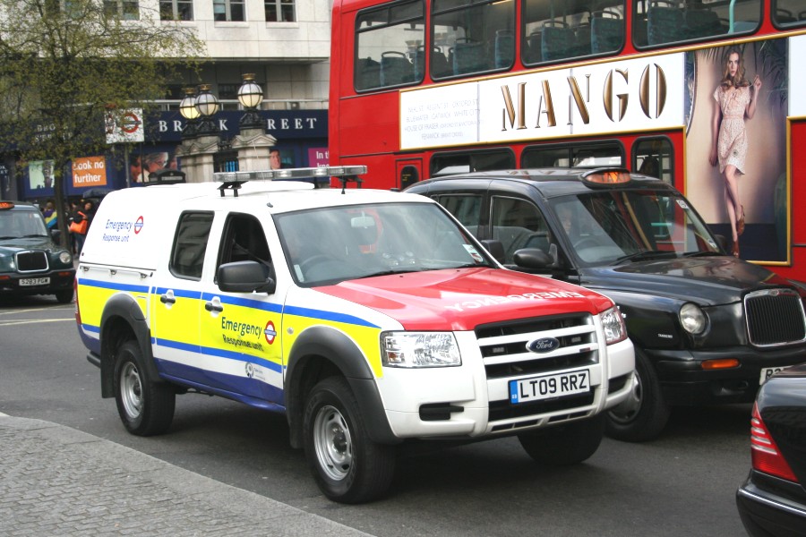 | Details: Having earlier used un-numbered Vauxhall Astra and Vectra estates cars, the duty manager of the Emergency Response Unit now has a somewhat chunkier Ford Ranger with high-visibility markings. Unfortunately the reflective stripes on the sides were applied over the fleetnumbers! 6786F was photographed heading down the Strand on 12th April 2010, with a rather large dent in the offside door. | |||
