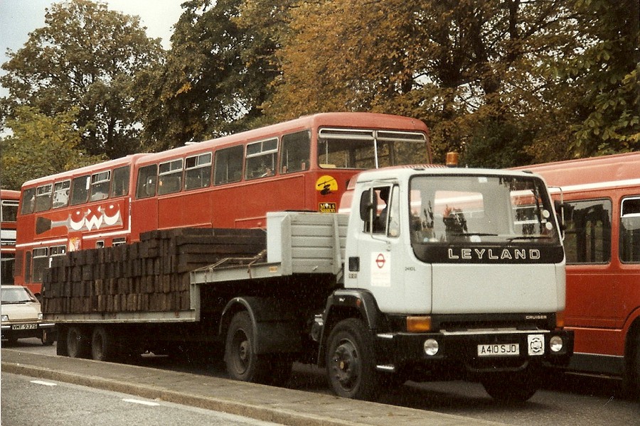 | Details: London Transport bought just two Leyland Cruiser articulated tractor units. 2389L, new in 1982, seems to have been seen a lot, and I have already published three photos of it. 2410L of 1983 was rather less conspicuous but can now also be illustrated thanks to a contribution by Malcolm Conway. On the 17th September 1989 it was found at Leytonstone, passing a line of buses engaged on railway replacement duties. Trailer YT28 is loaded with what looks like railway sleepers, and the lorry is on a stretch of road that disappeared when the A12 was extended to Hackney. 2410L was sold less than a year later, although YT28 was repainted blue and survived until 1995. | ||||
