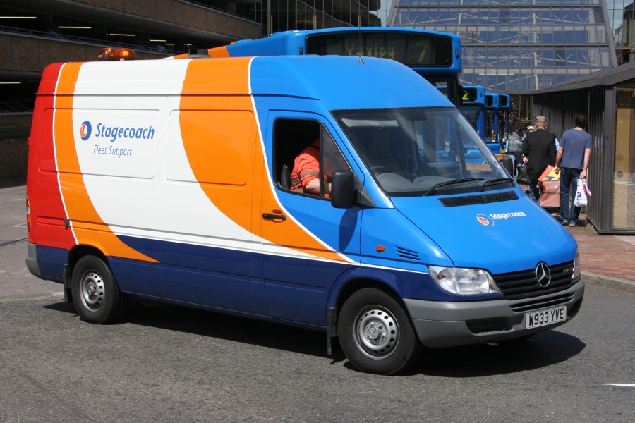 | Details: Mercedes-Benz Sprinter long-wheelbase van W933YVE was photographed in Peterborough Bus Station on 21st May 2010. A member of the Stagecoach East fleet, it wears the company livery introduced in 2000 but is not displaying a fleetnumber or local fleetname identifier. The rear 'swoops' on this livery are fairly standard, but the front ones vary somewhat between different designs of buses. On this van, the front colour divides are curved upwards in a non-standard way, somewhat reminiscent of Arriva's 'cow horns'. The livery on the rear was also notable, comprising orange chevrons on a red background! | ||
