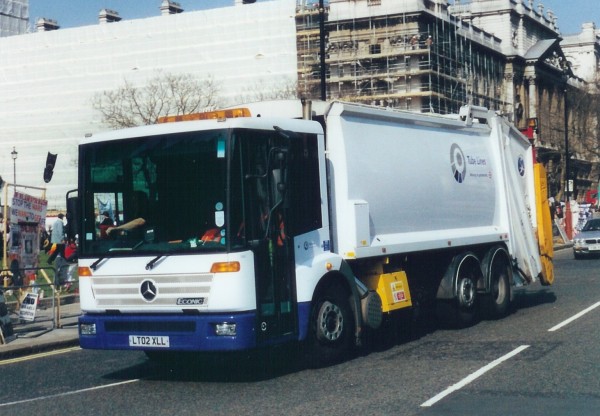 | Details: The latest generation of dustcarts used by London Underground are based on the attractive Mercedes-Benz Econic chassis cab. There are two variants, the example shown here being the three-axle version. 2582M (LT02XLL) was one of two bought in July 2002, and photographed at Parliament Square on 19/03/2003. | |||