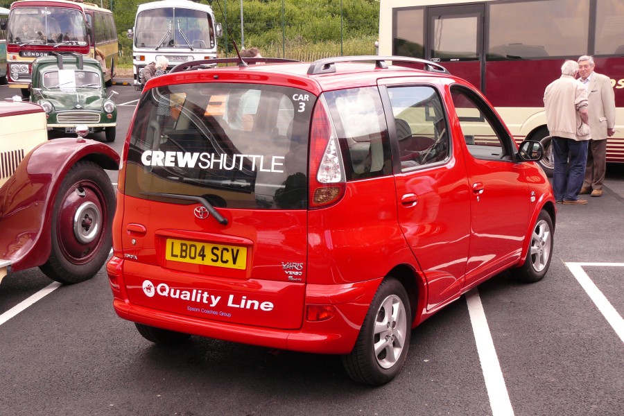 | Details: Parked amongst some vintage cars and coaches during the Epsom Garage open day on 12th June 2010, Toyota Yaris Verso LB04SCV is a crew ferry vehicle for the Quality Line operation. As can be seen, some (but not all) of these vehicles now carry fleetnumbers on the rear. By the way, the Verso is a taller variant of the standard Yaris car. | ||||