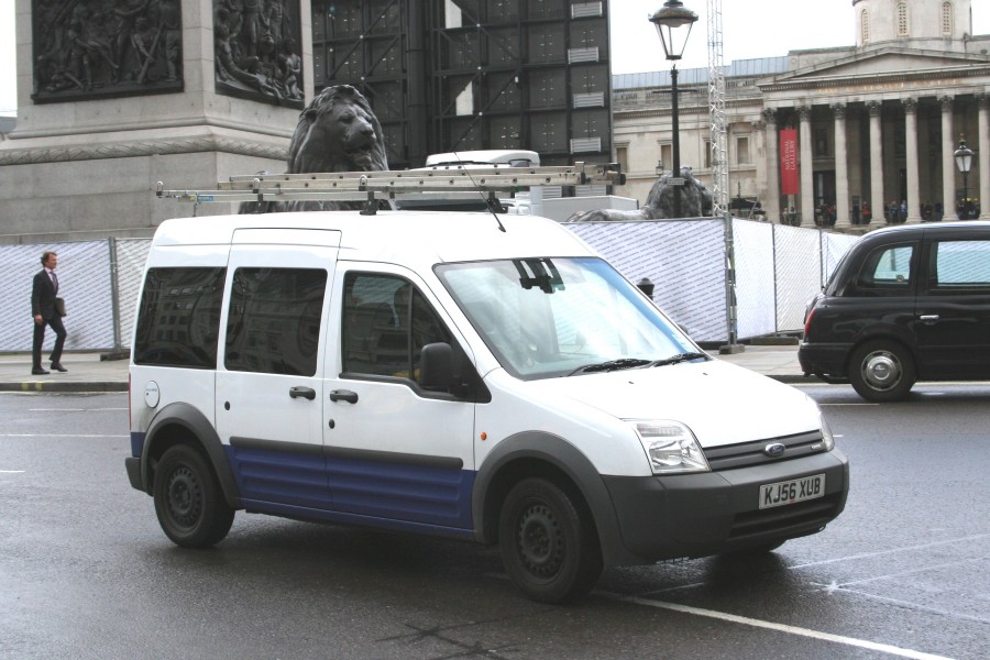 | Details: Readily identifiable as a former service vehicle, this Ford Tourneo Connect was originally 6099F in the Metronet fleet. It was returned off-lease around the end of 2009 and had its logos and fleetnumbers removed. It has since gained roof-bars but has also lost its smart wheeltrims (seen here), resulting in a slightly rough appearance. The tinted side windows were somewhat redundant on a gloomy 8th June 2010 as it passes Trafalgar Square. All Tourneo Connects have the additional doors on both sides. | |||
