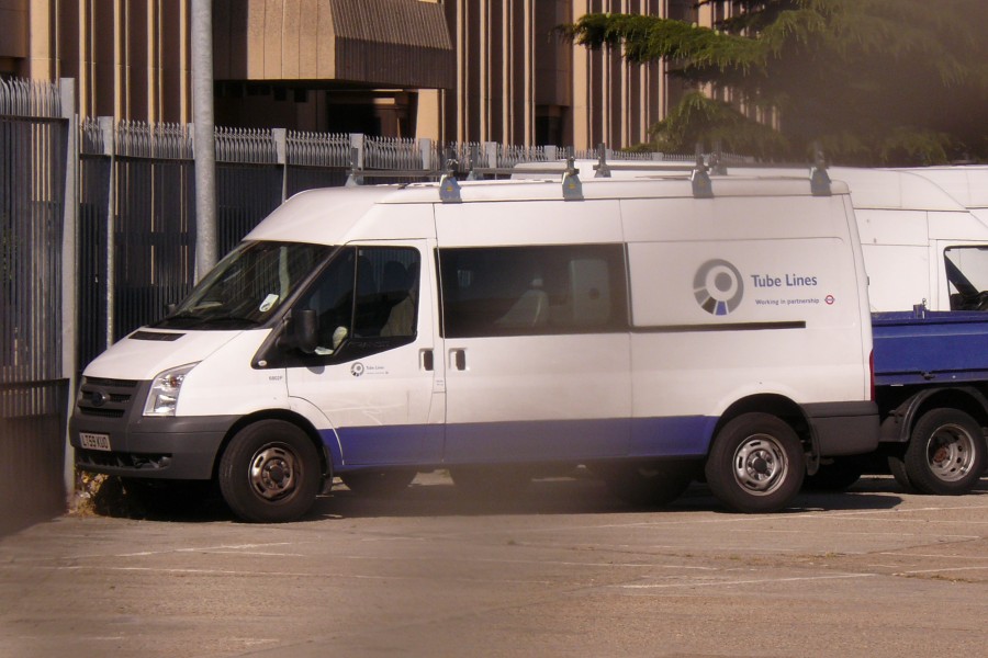 | Details: What you might call 'bog standard' this Ford Transit Mk7 crew van is used by Tube Lines from Lillie Bridge, where it was photographed (through the fence) on 10th July 2010. | ||||