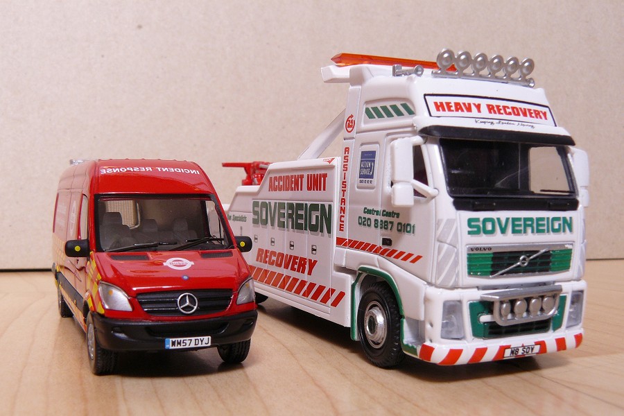 | Details: Model maker Oxford Diecast recently released a 1:76 replica of a Volvo tow truck in the familiar livery of Sovereign Recovery. Mainly metal with some plastic detail parts, this is an excellent model with some very fine printing. Apart from not exactly matching the real N8SOV the only other issue is a poor fit on some of the plastic parts (such as the front lights seen here). It was posed alongside Creative Master Northcord's Mercedes IRU van. | ||||