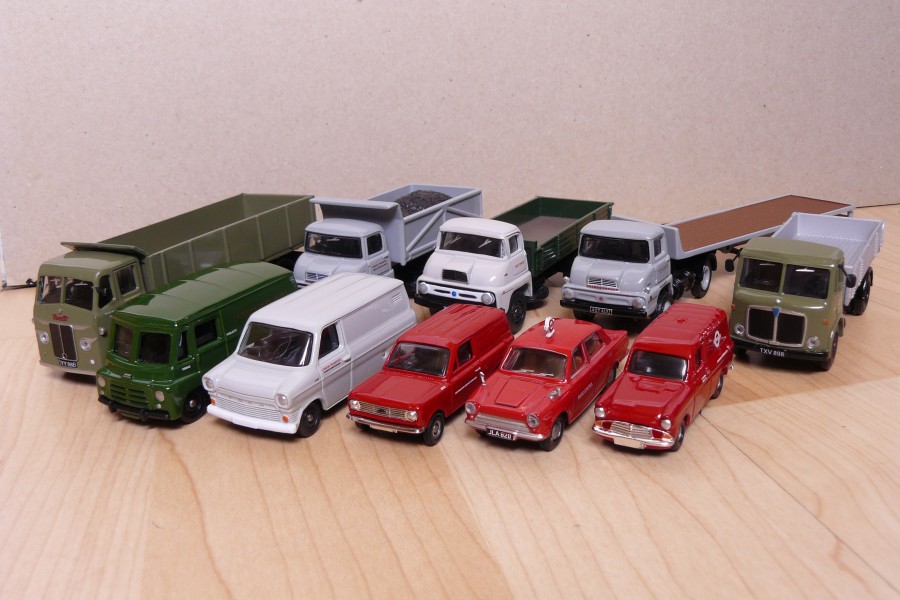 | Details: I plan to add a listing of all 'ready-to-run' models of London Transport service vehicles in the not too distant future. This will include photographs and reviews. In the meantime, this photograph shows most of the 1:76 models that have been produced in recent years (apart from the two modern vehicles already illustrated). The front row features the four vans from the Corgi Trackside set (green Austin LD, grey Ford Transit, red Bedford HA and red Ford Anglia) plus the Base Toys Ford Cortina radio control car. At the back are three Ford Thames Traders, an EFE tipper and artic flanking a Base Toys dropside. On the far left is the Base Toys Leyland Hippo tipper, while on the right is their AEC Mercury dropside. | ||