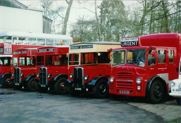 | Details: A very attractive line-up of vintage emergency service vehicles seen at Cobham Museum on 10th April 1994. On the left are 3 AEC Regent Auxiliary Breakdown Tenders, two in bus red and one in railway red/cream liveries. These were all rebuilt from STL type buses. On the right is 1279LD, a purpose built Leyland Titan PD3 Railway Breakdown Tender. The Capital Transport book on service vehicles contains lots of interesting information about vehicles of these types. | ||||||