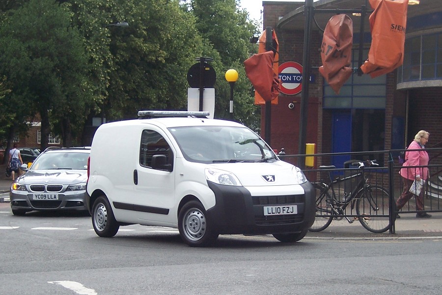 | Details: Ray saw two of these small unlettered Peugeot Bipper vans being delivered to Acton Works on 19th July 2010, and shortly afterwards being taken for test drives. He managed to capture this view of LL10FZJ about to pass Acton Town station. This type has not previously been used as service vehicles, and the fitting of light-bars suggested that they could perhaps be destined for the British Transport Police fleet. However, a third van (LL10FZM) was seen later in the month in TfL Streets markings. | |||