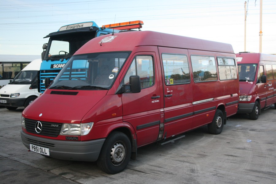 | Details: In a rare of example of service vehicles being sold on to become service vehicles, Ensignbus acquired two former East Thames Buses Mercedes Sprinter minibuses in August 2010. Both were photographed at Purfleet garage on 12th August, the day after they arrived. P851OLL has had its lettering stripped off (although remenants are visible, including a Dial-a-Ride roundel on the roof dome) while P185OLC retained a full set of East Thames lettering. Alongside is Scania tow truck UJF182 while just visible at the far left (beyond the Mk6 Ford Transit) is Ford Transit Mk5 minibus M84TAK. This had been bought from Herberts Travel of Shefford a few weeks earlier for possible use as a crew ferry vehicle. Following the arrival of the Mercedes, it was put up for sale. | ||||