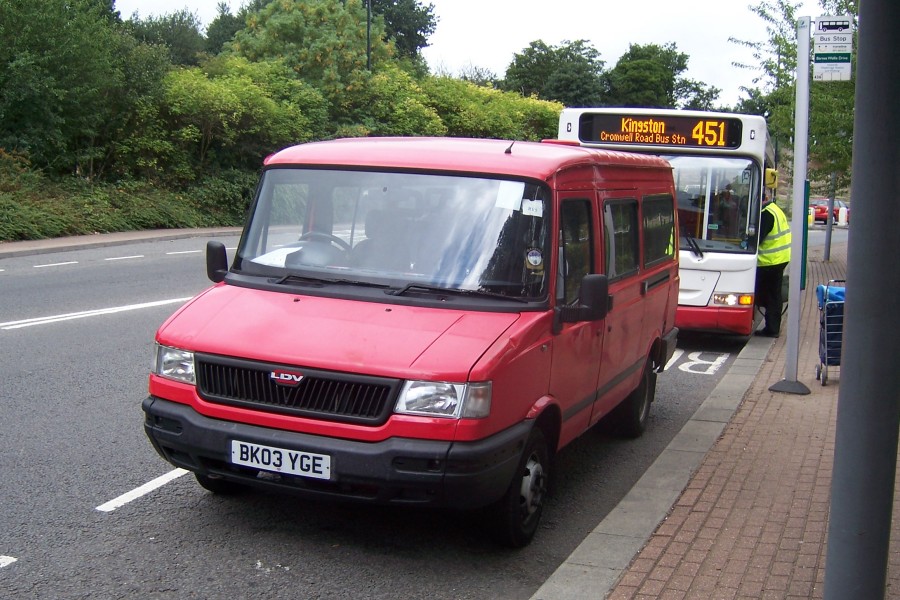 | Details: Travel London bought quite a few former Royal Mail vehicles for use as service vehicles. These included Peugeot Partner cars and LDV minibuses. Typifying the latter is LDV Convoy BK03YGE, numbered 8978 by Travel London but known locally as RV5 (as shown in the top right corner of the windscreen). Now in use as a crew ferry vehicle, it has also served as a driver's rest vehicle at Cobham. On 21st August 2010 it was found at Brooklands Tesco undertaking a crew change on a route 451 bus. This route number disappeared in the restructuring that took place at the end of that month. | |||