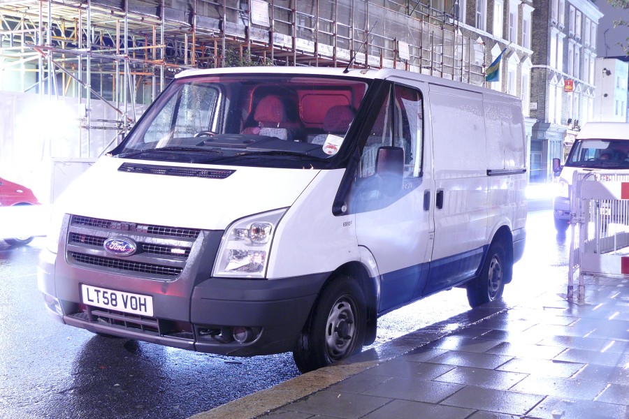 | Details: For night-time photography, under-exposure is a common problem. For my first few shots on the night of 29th September 2010 I went the other way and over exposed a few. This one is not too bad (15sec at f2.8), and shows logoless Ford Transit van 6580F parked on Seymour Place (not very near Griffith House) ahead of London Underground 6894F. A nice composition of another pair of Transits on the other side of the road was spoiled by passing cars leaving headlight trails. | |||