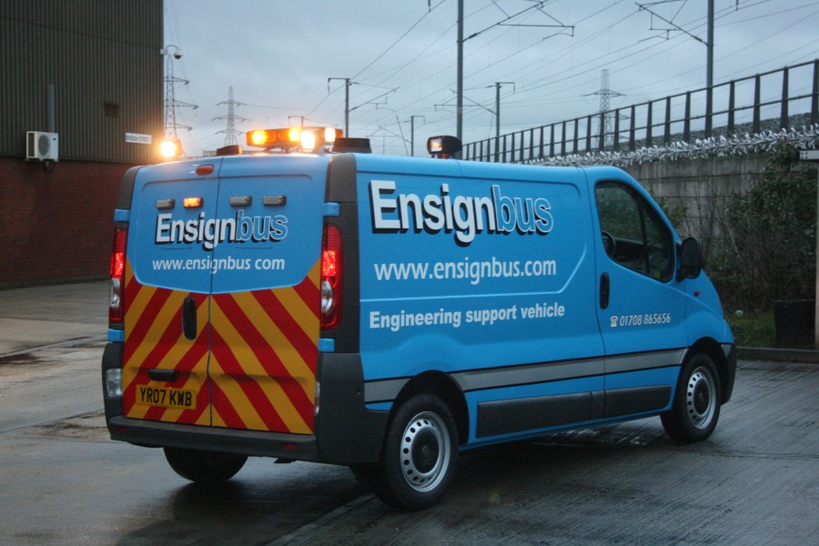 | Details: Ensignbus acquired this Vauxhall Vivaro van in February 2011 and soon had it repainted from plain white into this smart blue and silver livery. It was photographed at Purfleet garage early on the 26th of that month, the gloom allowing the numerous lights to be shown in action. These were already on the vehicle when it was acquired and it is believed it was previously owned by a security contractor. | ||||