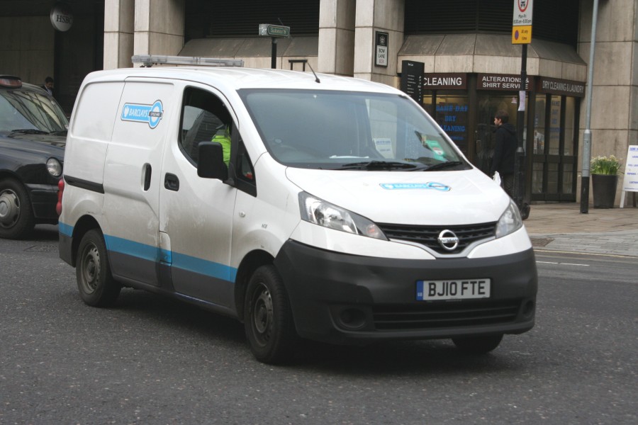 | Details: The various vehicles operated to support the Barclays TfL Cycle Hire scheme could be considered to be LTSVs, especially as they have fleetnumbers and a familiar-ish white/blue livery. Shown here near Mansion House Station on 17th February 2011 is van number N08. This is a Nissan NV200, a type that has not featured in any of the other SV fleets. Rather than towing cycle trailers, these vans seem to be engaged in dealing with faults on the bicycle docking stations and pay-points. | ||