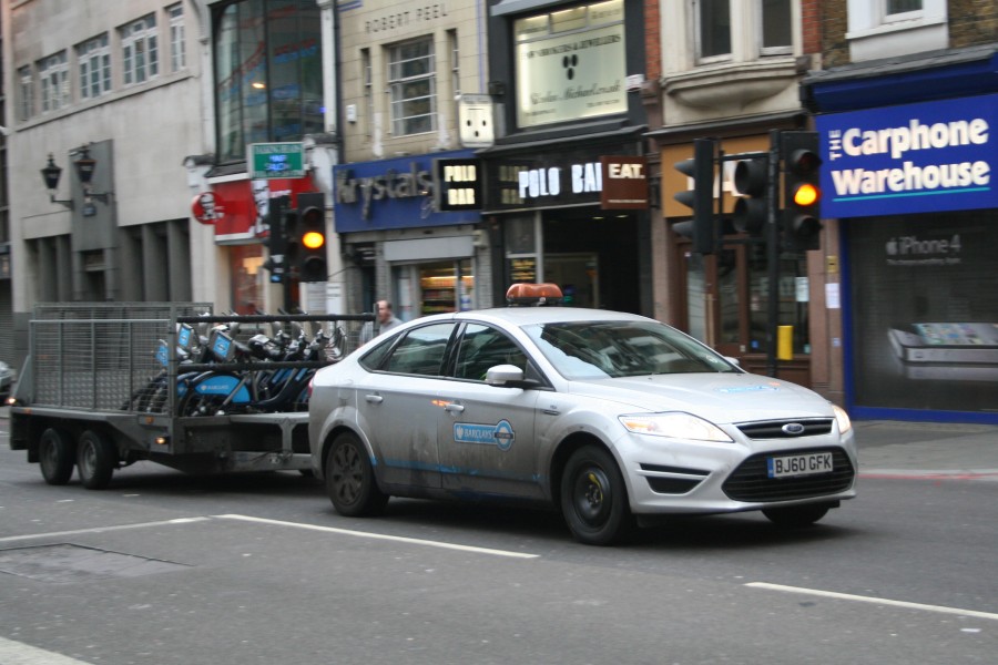 | Details: Running the TfL Cycle Hire scheme involves a number of vehicles with bicycle carrying trailers. These move bikes around to try and balance supply with demand. Vehicles used have included Ford Focus cars and Alke electric trucks. At least in the area where I work (Southwark), the Alke trucks have been rare for the past few months, a further batch of Ford cars being the most commonly seen. The new cars are Mondeos like number M04, seen speeding past Bishopsgate Police Station on 6th February 2011. Note that the car is running on a spare wheel, and that the trailer is a hired one rather than one of the custom built examples seen in the photo linked above. | ||