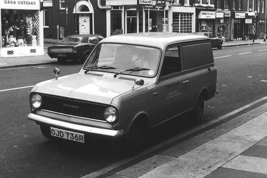 | Details: Apart from the 'Agent Smith' character in the passenger seat, the most notable thing about this service vehicle is not particularly apparent! New in April 1977, Bedford HA van 2036B was one of a pair delivered in a distinctly non-standard light blue livery. Both were allocated to the Works and Building Manager at Grays Inn Road, near where this photograph was taken that month. Note that the mirrors are still round but now elongated. Further Bedford HAs were delivered in blue livery (apparently due to Bedford not having any red ones in stock) in 1978 (2120B) and 1980 (2228B to 2234B). | |||