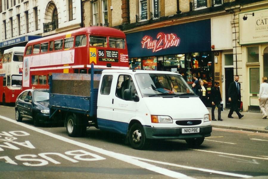 | Details: On the Mk5 Ford Transit, crew-cabs were available with additional side windows, although they still had a second door on the nearside only. 4532F was new in September 1995 and lasted very nearly six years. It was however looking a bit worn when seen passing Victoria Station on 26th June 2000. | |||