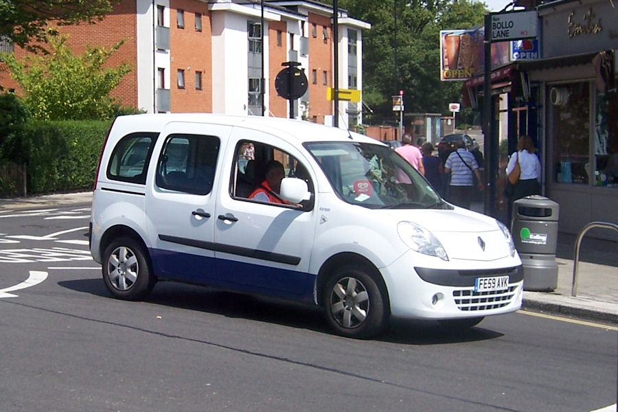 | Details: Renault Kangoo estate car 6816R was one of many vehicles delivered in 2009 in unlettered plain white/blue livery. While most of the others have now gained London Underground markings (and a red stripe), 6816R remains in this anonymous condition. Reports suggest it is assigned to the SSL operation, and it was photographed passing Acton Town Station on 25th July 2011. | |||