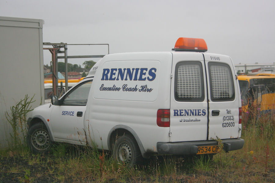 | Details: Seemingly put out to grass at Dunfermline depot on 16th August 2011, this early Vauxhall Combo van is lettered for Rennies Executive Coach Hire. The five-digit fleetnumber is the only clue to the fact that this company is owned by Stagecoach. I recently found a website with a fairly comprehensive list of the (non-London) Stagecoach fleet. What is interesting is that this includes the service vehicles, all of which are numbered in the 9xxxx range. See http://www.uk-buses.co.uk/stagecoach.php for more. | ||