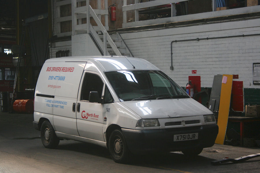 | Details: Continuing our quick tour of the UK, this is Go North East's Chester-le-Street garage on 24th August 2011. Service van 141 is lacking any badging, and is of a design that was produced by several manufacturers. Although it could easily be a Peugeot Expert, X751DJR is in fact a Fiat Scudo. I used to know Chester-le-Street quite well, though the last time I was there the buses were mainly Bristol VRTs and Leyland Nationals! | ||