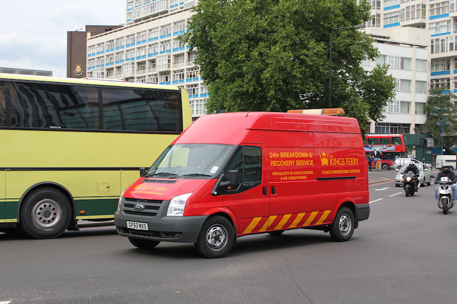 | Details: The Kings Ferry is a Kent-based commuter coach company that retains its identity despite ownership by National Express. GF60MXS is a long-wheelbase, high-roof Ford Transit van used by their engineering division. Although the coaches wear a greenish-yellow livery (by coincidence one was passing at the same time), all the vans seem to be red. Photographed at the Elephant and Castle on 14th July 2011. | ||