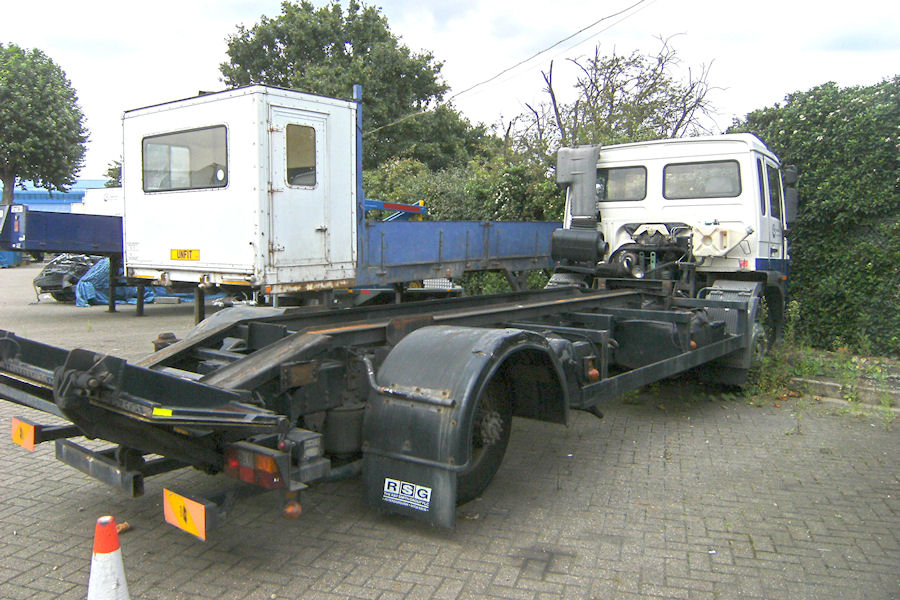 | Details: Of the three Volvo FL6 demountable lorries remaining in stock, 2570V was withdrawn due to accident damage in January 2011. It was still in the yard at Acton Works on 31st August, with a missing rear wheel and a smashed windscreen. This view clearly shows the runners on the chassis used to guide bodies into position, and also the fold-under tail-lift. Also visible is one of the crew-cab demountable bodies (either DB11 or DB12) with an Unfit plate attached. Perhaps this body was on 2570V when it had its accident. Partially hidden behind this is a hydraulic hoist loaded onto a small trailer. The trailer is possibly T69 or perhaps T63 but unfortunately it was not photographed. Further back are dropside trailer CT34 and the mangled front-end of Ford Transit 6932F, also accident damaged. | ||||