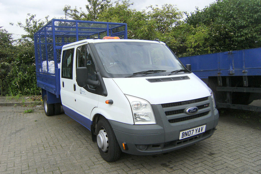 | Details: This vehicle is slightly more unusual than it looks, and I must thank the photographer for finding out its background. Ford Transit dropside tipper BN07YAV had originally entered service as part of what I will call the UUU (un-marked, un-numbered, un-liveried) fleet. It was based at Lillie Bridge (home to a few UUUs, such as BJ06YRV) and fitted with a portable generator. It was at some point stolen, then eventually recovered. Strangely it was then given a repaint into standard livery, and was fitted with a rubbish cage. When photographed in the lorry yard at Acton Works on 31st August 2011 it had only recently entered service, quite possibly replacing venerable Transit 5474F. | ||||