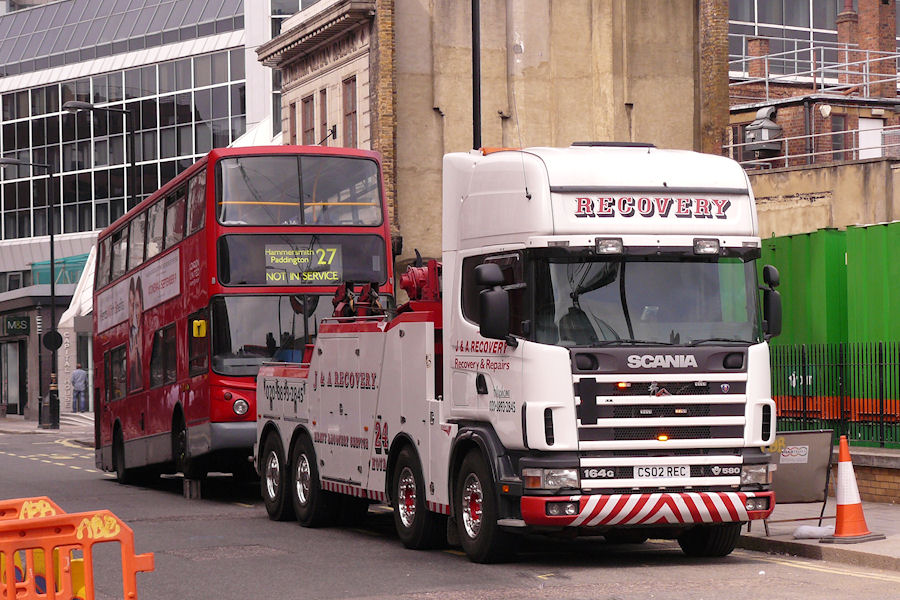 | Details: A trip to Edgware Road Station on 3rd September 2011 was slightly disappointing. Several new LUL vehicles had been reported in the small yard here. However, on this day the yard area was crowded with contractors vehicles working on the adjacent building site (the new traction power supply building going up on the site of the Griffith House yard). In compensation, parked outside was this recovery truck. CS02REC is a four-axle Scania 164G 580 with Boniface bodywork and operated by J and A Recovery. It was picking up (literally) a slightly unusual bus. Route 27 is normally worked by SLE and VLE class buses from Stamford Brook Garage. However, this was an early VA bus from Hounslow. Hounslow had operated an extra service over part of route 27 in July and August to cover for Underground closures. However, they also operate the night service on the route. The green containers on the right are in the area recently cleared by the demolition of the traincrew offices. | |||