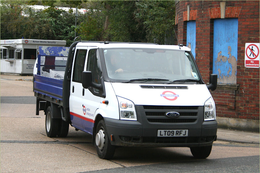 | Details: Most sightings of 6664F have been of it out and about at night, and we are not sure of where it is allocated. A Ford Transit dropside truck with crew-cab and tail-lift, it was new in Metronet livery in 2009, later gaining the Underground markings and red stripe. On 27th September 2011 Malcolm captured it leaving Acton Works. | ||||