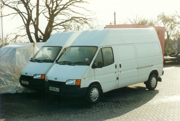 | Details: Basking in the sunshine at Acton Works shortly after delivery in March 1993 are two high-roof, long-wheelbase Ford Transit 190 vans. Part of a batch of 10 that were allocated to Jamestown Road in Camden, 2520F (K209RLO) and 2521F (K210RLO) had not yet had lettering added to their plain white livery. As Jamestown Road was responsible for commercial advertising, it is presumed that these vans left the fleet when these services were hived off to TDI. | |||||
