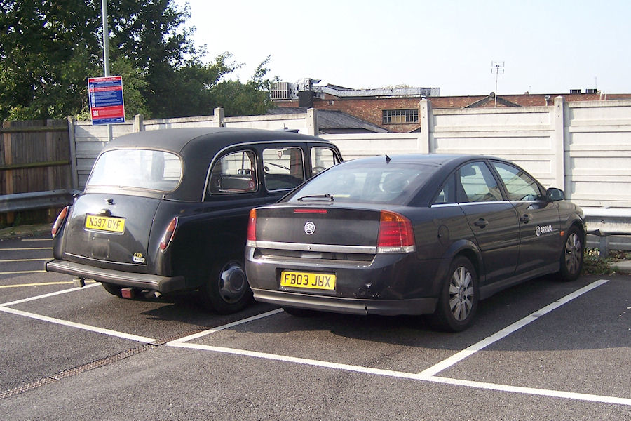 | Details: Arriva's Grays operation (which is technically part of Arriva Southend but has links with Arriva Kent Thameside within Arriva Southern Counties....) has recently started acquiring former London taxis for use as crew ferries. N397OYF seen at Romford on 3rd October 2011 had a fleetnumber applied to the rear. This appeared to be CF29, suggesting that there may be a few more. The car alongside is also based at Grays and is allocated fleetnumber CF18. This Vauxhall Vectra was acquired from the Milton Keynes operation of Arriva Shires (where it was fleetnumber 1376) in 2010. I wonder which car the drivers prefer! | ||||