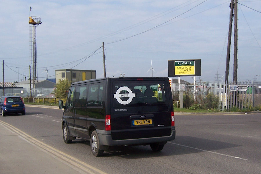 | Details: YR11WRN was one of two Ford Tourneo minibuses operated by Stagecoach London at West Ham from mid-2011. A batch of Ford Transit minibuses was delivered to West Ham later in the summer and it was thought that the first pair may have been temporary dealer loans pending their arrival. However YR11WRN then moved to the Rainham base, and it also gained a large Buses roundel on the back window. It was photographed on Ferry Lane, near the garage, on 24th September 2011. | |||