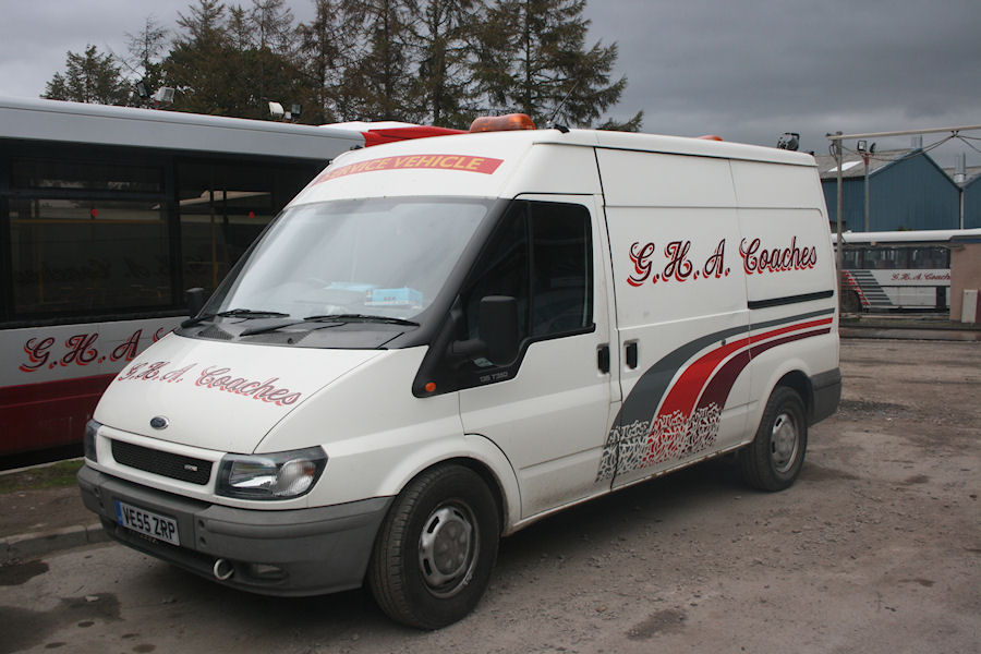 | Details: Photographed at the Wrexham garage of GHA Coaches, VE55ZRP is a rare (at least in London terms), higher-powered Ford Transit 135 T350 van. Note the 'Service Vehicle' lettering above the windscreen. | ||