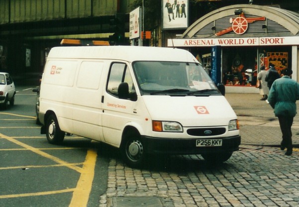 | Details: For a few years, bus station support vehicles were painted in a white livery, as seen on this long wheelbase Ford Transit 150 van at Finsbury Park on 21/11/2000. 4721F (P256KKY) was new in 1996. | ||||