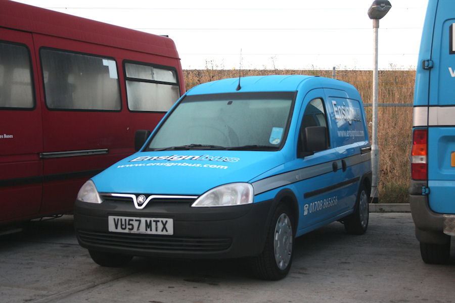 | Details: Newly acquired Vauxhall Combo van VU57MTX was photographed at the Ensignbus premises in Purfleet on 19th October 2011. To the left is a former East Thames Buses Mercedes-Benz Sprinter minibus. This is not thought to be one of the pair acquired in August 2010. P185OLC was soon repainted blue while P851OLL was sold without being used. | ||||