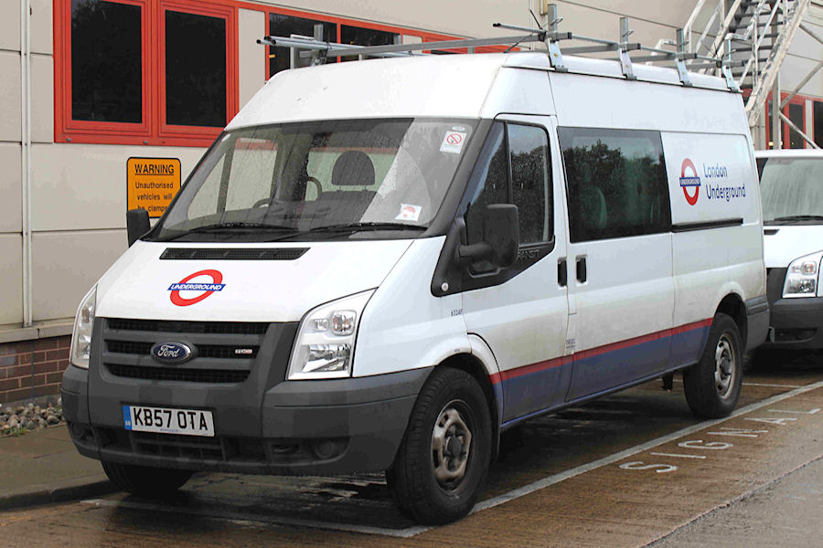 | Details: 6324F is a long-wheelbase mid-height Ford Transit crew van new in 2008. Now wearing London Underground livery, it was photographed at Acton Works on 26th October 2011, parked in front of newer 7094F. | ||||