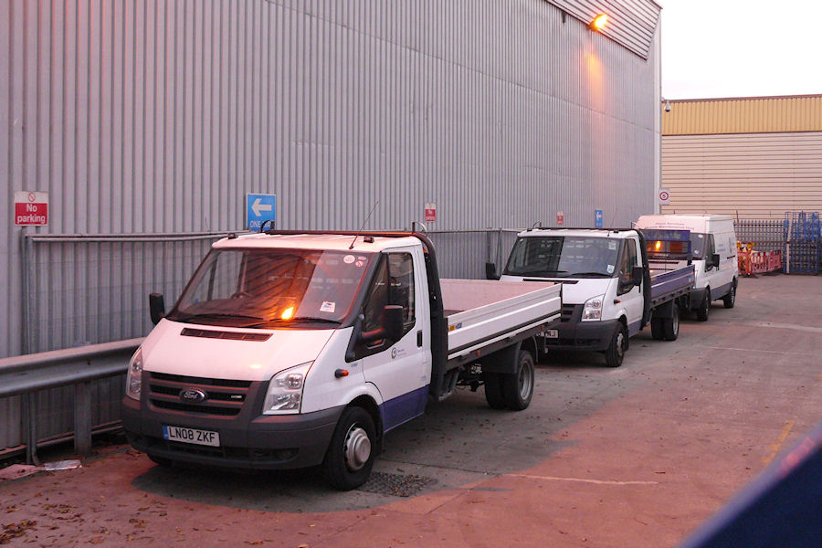 | Details: At dusk on November 18th 2011, three service vehicles were photographed at the Tube Lines depot on North Crescent (West Ham), underneath a load of no parking signs! Nearest the camera was Ford Transit dropside truck 6386F, the only example with a non-blue body. Behind are dropside 6570F and plant services van 6858F. | ||||||