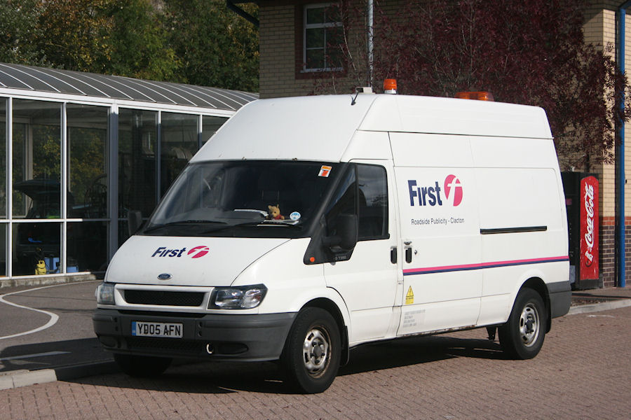 | Details: Photographed at Lakeside Bus Station on 5th October 2011, YD05AFN is a high-roof Mk6 Ford Transit van in the First Essex Buses fleet. It carries fleetnumber 90413 on the fuel filler cap, and is lettered for Roadside Publicity - Clacton. | ||