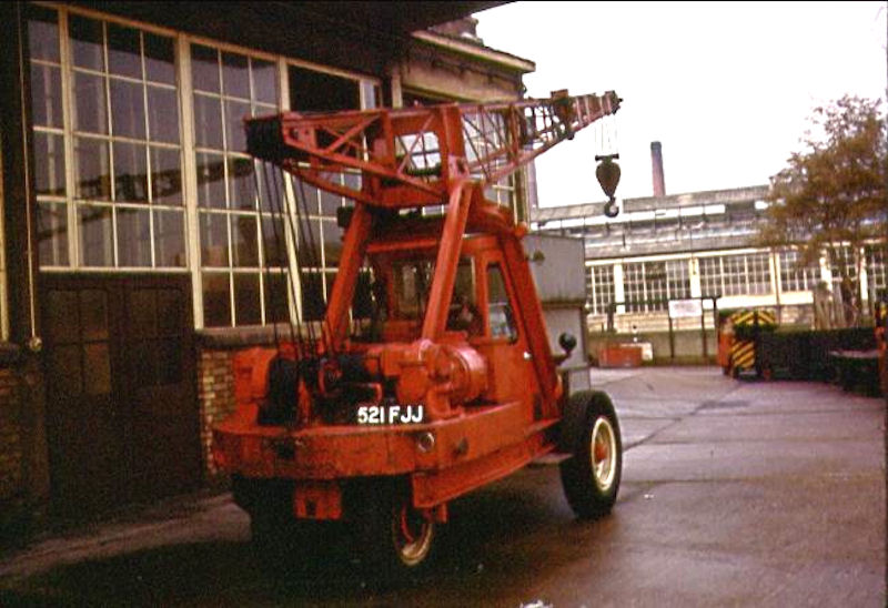 | Details: Like 968R, 1292R was registered despite being used only within Chiswick Works. Unlike 968R, it did actually display its registration number, as seen in this photo taken on 8th November 1966. Red livery was not standard for such vehicles at the time, but was also worn by a similar un-numbered crane, since preserved. At first glance, I thought the red object in the background was an LSBL Ford Transit van like 5301F, but they were still 35 years away! It certainly appears to have wheels, and chevrons on the end. Any suggestions? | ||||
